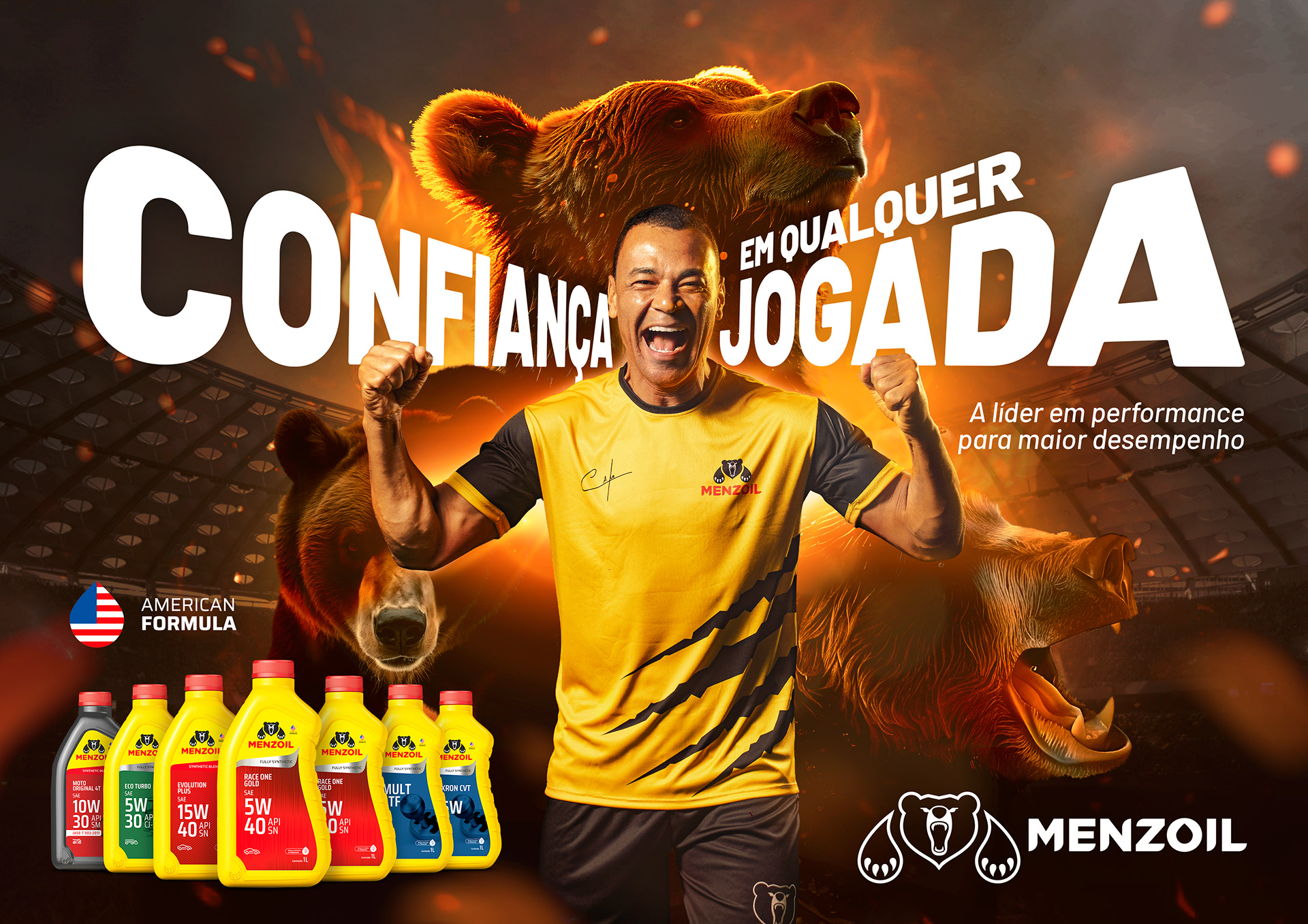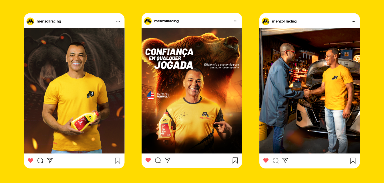A Menzoil, marca de óleo automotivo, precisava se reposicionar no mercado por meio de um novo rebranding. Para isso, desenvolvemos uma campanha inovadora, com o lendário Cafú como garoto-propaganda. A escolha visa associar a imagem de confiança do ídolo à força do urso, mascote da marca. Todo o visual foi inspirado nos campos de futebol, alinhando-se à entrada da Menzoil como patrocinadora de importantes jogos.